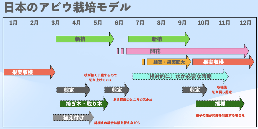 しかもアビウは,水が好きである.だから排水は良くしつつ,乾かしすぎないという管理がとても大事になる.水が必要な時期にしっかり水を効かせることで,新梢,開花,果実肥大がかなり変わってくる.