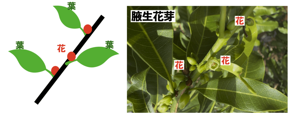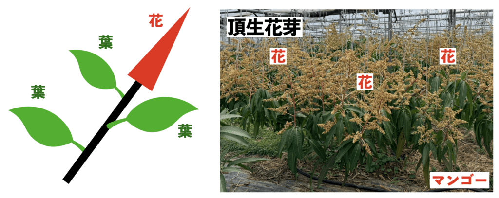 マンゴーやアボカド,レイシなどは,枝先に花がつくタイプで,これらは頂生花芽と呼ばれる.